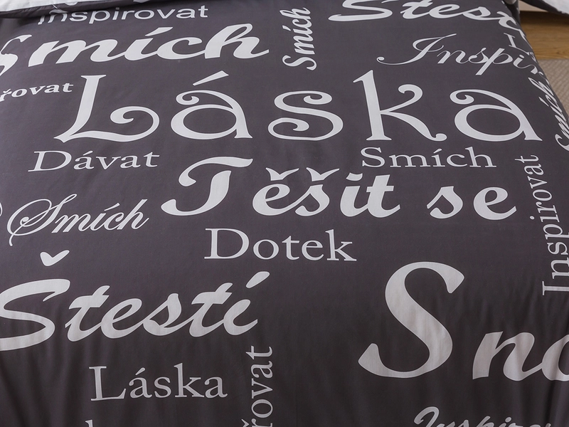 Bavlnené obliečky a sivo - biela farebná kombinácia ponúkajú moderný vzhľad, kde vzor tvoria pozitívne a motivačné slová ako napríklad ŠŤASTIE, Láska, DOTYK, ... ktoré dodajú priaznivú energiu do každého rána. Táto posteľná súprava s prehľadom doladí interiér spálne aj detskej izby. Obliečky Renforcé sú vyrobené z bavlny s úpravou renforcé, ktorá je jemná a odolná. Renforcé bavlna nedegraduje ani materiálom ani farebnosťou, a preto sa tento produkt radí medzi luxusné obliečky, ktoré si zachovajú svoj vzhľad aj po opakovanom praní. Oceníte odolnosť, stálofarebnosť i celoročné využitie s dlhou životnosťou materiálu, kedy tieto renforcé obliečky nestrácajú na kráse ani po opakovanom praní.