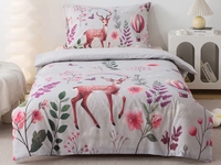 Obliečky RÍŠE SNOV vás prenesú do kúzelného sveta fantázie, kde sa nad svetlým sivým podkladom jemne vznáša dúha, jeleň a lúčne kvety v tlmených pastelových farbách. Tento snový motív spoločne s jemnou bavlnou pôsobí upokojujúcim dojmom a vytvára atmosféru plnú nehy, ktorú deti zaiste pri zaspávaní ocenia. Obliečky sú vyrobené z bavlny Renforcé, ktorá je nielen príjemná na dotyk, ale aj priedušná a odolná voči opotrebovaniu, vďaka čomu patrí medzi luxusnú posteľnú bielizeň vhodnú na každodenné použitie. Obliečka na vankúš má digitálnu tlač z oboch strán a obliečka na perinu je zo spodnej strany jednofarebná.
