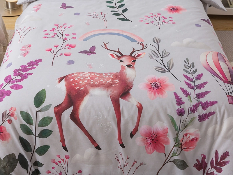 Obliečky RÍŠE SNOV vás prenesú do kúzelného sveta fantázie, kde sa nad svetlým sivým podkladom jemne vznáša dúha, jeleň a lúčne kvety v tlmených pastelových farbách. Tento snový motív spoločne s jemnou bavlnou pôsobí upokojujúcim dojmom a vytvára atmosféru plnú nehy, ktorú deti zaiste pri zaspávaní ocenia. Obliečky sú vyrobené z bavlny Renforcé, ktorá je nielen príjemná na dotyk, ale aj priedušná a odolná voči opotrebovaniu, vďaka čomu patrí medzi luxusnú posteľnú bielizeň vhodnú na každodenné použitie. Obliečka na vankúš má digitálnu tlač z oboch strán a obliečka na perinu je zo spodnej strany jednofarebná.