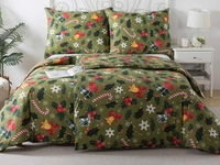 Vianočné obliečky a zelený podklad posiaty symbolmi Vianoc, prinášajú sviatočnú atmosféru do našich domovov. Olivový odtieň zelenej farby zdobia zvončeky, cezmína, snehové vločky a mnoho ďalšieho, čo rozžiari každý interiér.  Vianočný vzor v kombinácii s Renforcé bavlnou navodí tú správnu atmosféru pre kvalitný spánok. Samozrejmosťou renforcé bavlny je na dotyk príjemný povrch, savosť aj vzdušnosť a odolnosť materiálu voči častému praniu. Pri praní môžete pokojne zvoliť vyššie pracie teploty, úprava bavlny renforcé a odolné farby to vydržia.