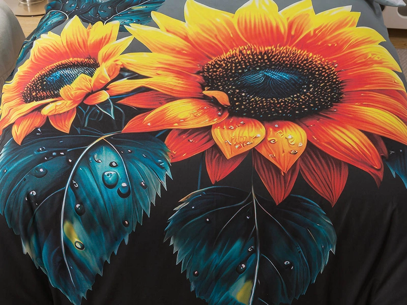 Oživte si spálňu obliečkami s digitálnou tlačou slnečníc na tieňovanom sivo - čiernom podklade, ktorý dodá miestnosti šarm a nadčasový ráz. Obliečky SLNEČNICE rozžiaria vašu spálňu teplými tónmi oranžovej a žltej pre pozitívnu energiu s kontrastom modrých - tyrkysových listov. Renforcé obliečky z bavlny sú hladké a príjemné na dotyk s dobrou savosťou a odolnosťou voči opotrebovaniu či strate farby. Obliečka na prikrývku je na spodnej strane jednofarebná, obliečka na vankúš má potlač z oboch strán.