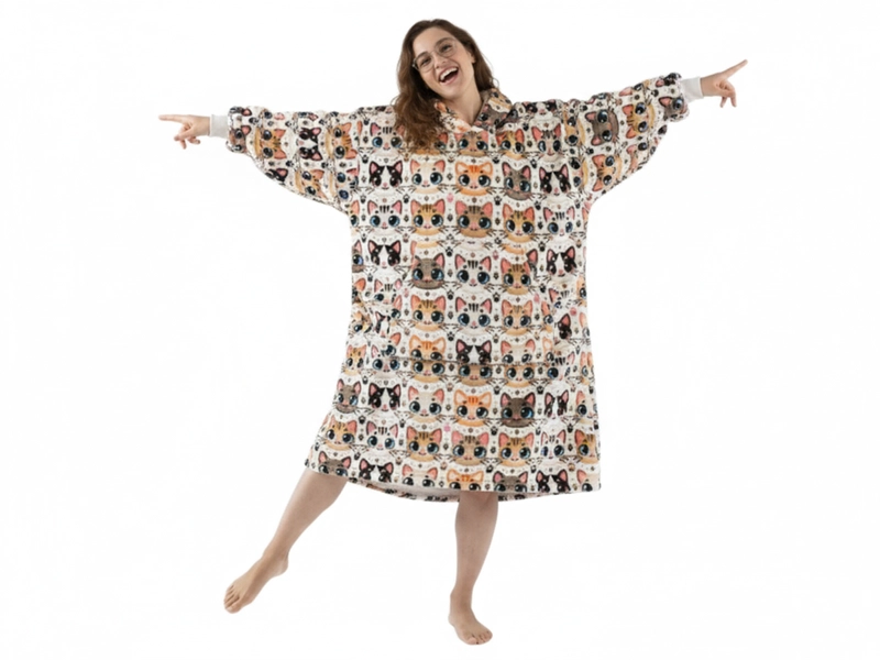 Mikinové deky sú veľmi mäkké, krásne hrejivé a pohodlné na nosenie po celý deň. Roztomilé mačky vo farbe béžovej a oranžovej na bielej v podklade a zamatový vzhľad si získá aj vaše srdce. Využijete ich ako domáce oblečenie aj ako teplú mikinu pri záhradnom posedení s priateľmi. Predĺžená deka s rukávmi a kapucňou vás príjemne zahreje vrstvou mikroplyšu, a to pokojne pri televízii, pri čítaní knižky, alebo rovnako ako mikroplyšová deka, tak aj teplá mikina dobre poslúži na terase za chladného počasia. Táto oversize mikina má UNI veľkosť (predĺžené rozmery viď fotografie) a dopraje pohodlie jak pre ženy, tak aj pre mužov. Sú veľmi ľahké aj skladné, a tak si ich môžete pribaliť spoločne so županom a mať pohodlie aj na dovolenke či na chate. A údržba? Mikinové deky stačí vyprať, vysušiť pokojne aj s použitím sušičky na jemný program s nižšou teplotou a opäť sa môžete zababušiť do teplúčka.