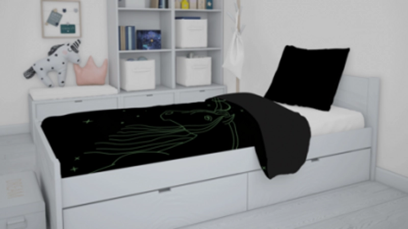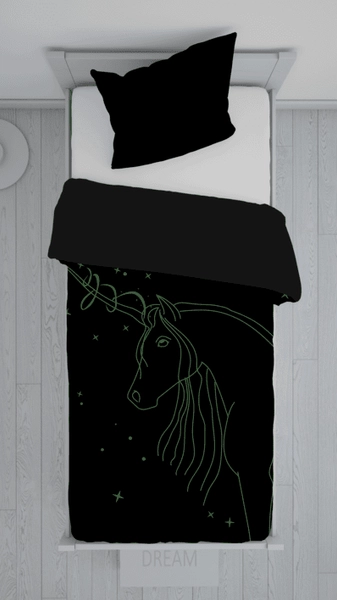 Svietiace obliečky a motív jednorožca poteší teraz aj tých najmenších. Ušľachtilé bájne zviera prináša jemnosť a harmóniu do každej detskej postieľky a po zhasnutí dieťatko ukľudnia svietiace obrysy obrázku (viď čierny obrázok). Oceníte tiež príjemný, vzdušný materiál zo 100% bavlny, praktické zapínanie na zips a farby, ktoré sú vhodné pre detskú pokožku.