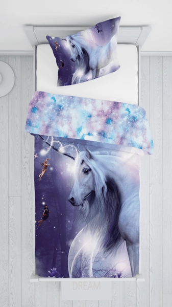 Vrchná strana obliečky na paplón je s obrázkom a spodná strana s dúhovým vzorom, obliečka na vankúš je s jednorožcom z oboch strán.