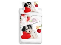 3D obliečka s motívom psíka a červeného srdiečka efektne doplní každú izbičku či manželskú posteľ, dodá celej spálni romantickú atmosféru a pozitívnu energiu. Jemný materiál z mikrosaténu je mimoriadne odolný, dobre drží farby, rýchlo schne a nemusí sa žehliť.