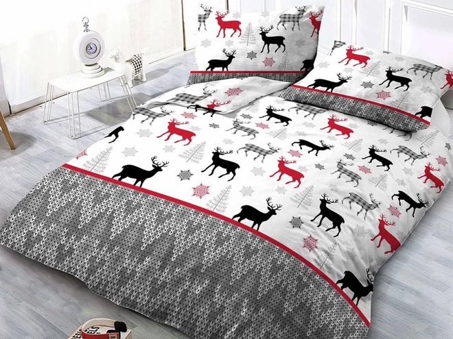 Francúzske obliečky a severský vzor LYANA osvieži každú spálňu. V spodnej časti obliečky nájdete efektnú imitáciu pletenej vlny, ktorá prechádza do bieleho podkladu s príhodným motívom jeleňov, vločiek a stromčekov. Štýlovo ladené farby sivej, červenej a čiernej na bielom podklade prispejú k pohodovej atmosfére interiéru počas zimných dní aj v období sviatkov. Hladká 100% bavlna zaručí hebkosť a vzdušnosť materiálu.