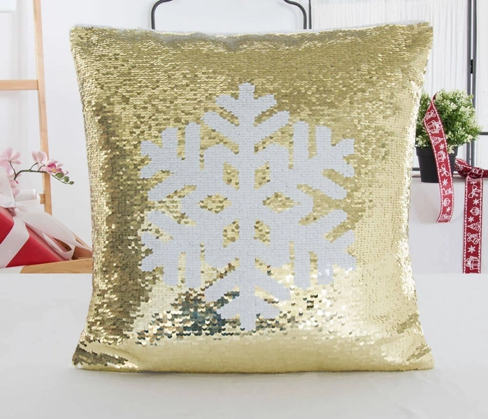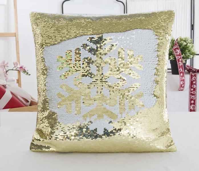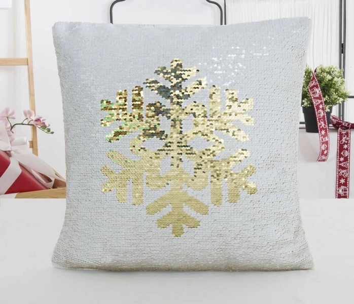 Vďaka rafinovane našitým flitrom na prednej strane ma dva meniace sa designy. Jedným ťahom ruky po povrchu sa biela vločka na zlatom pozadí zmení na vločku zlatú na bielom podklade. Váš domov tak nikdy nebude rovnaký. Druhú stranu obliečky tvorý jednofarebný biely mikroplyš s kráktkymi chĺpkami jemnými ako zamat.