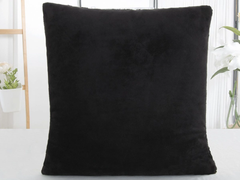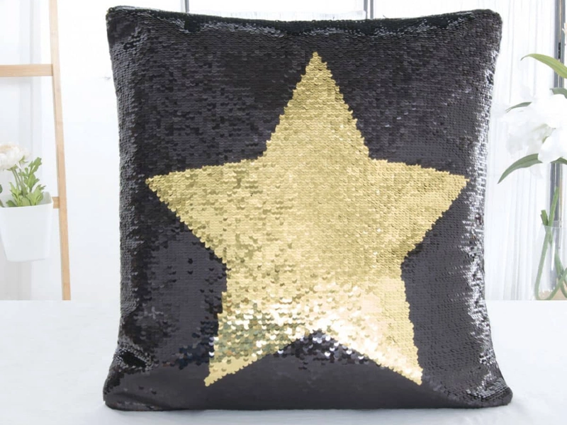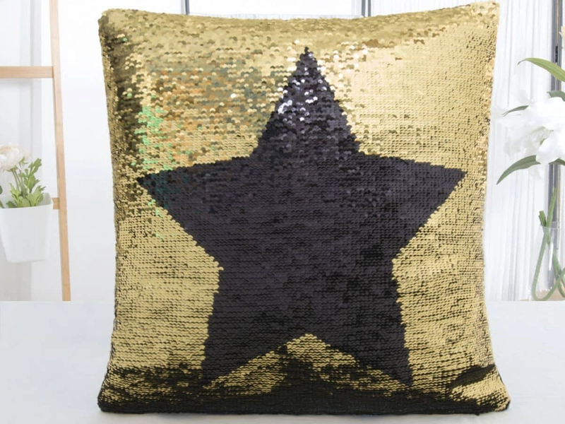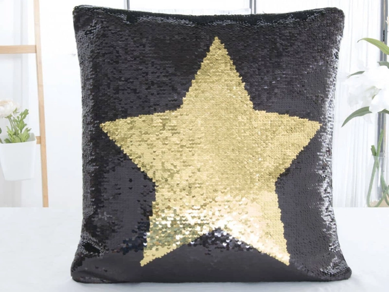 Vďaka rafinovane našitým flitrom na ňom nájdete dva meniace sa dizajny. Na prednej straně zaujme zlatá hviezda na čiernom podklade a ľahkým pohybom ruky po povrchu ohromí čierna hviezda na zlatej farbe. Zadná strana obliečky na vankúš je jednofarebná z čierneho mikroplyšu s krátkymi chĺpkami jemná ako zamat.