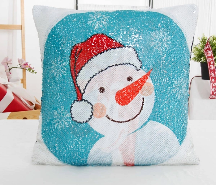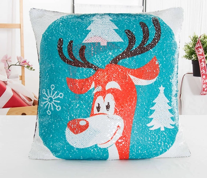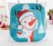 Vďaka rafinovane našitým flitrom na ňom nájdete dva meniace sa designy. Na prednej straně sa usmeje veselý sob na tyrkysovom podklade a ľahkým pohybom ruky po povrchu vás poteší snehuliak. Zadná strana obliečky na vankúš je jednofarebná z čierneho mikroplyšu s krátkymi chĺpkami jemná ako zamat.
