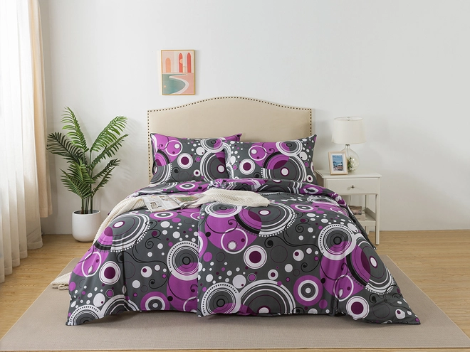 Svieže a moderné sú bavlnené obliečky ŠÁRKA. Kruhy, krúžky a kružnice! Tento vzor a kombinácia farieb fialovej, slivkovej, bielej a čiernej rozjasní každú spálňu a vnesie do nej príjemnú energiu. 100% bavlna zaručí vzdušnosť, savosť a celoročné využite. Francúzsky rozmer obliečky vcelku na 2 postele je ideálny pre páry alebo pre všetkých, ktorí sa radi zababušia pod perinu 200x220 cm.