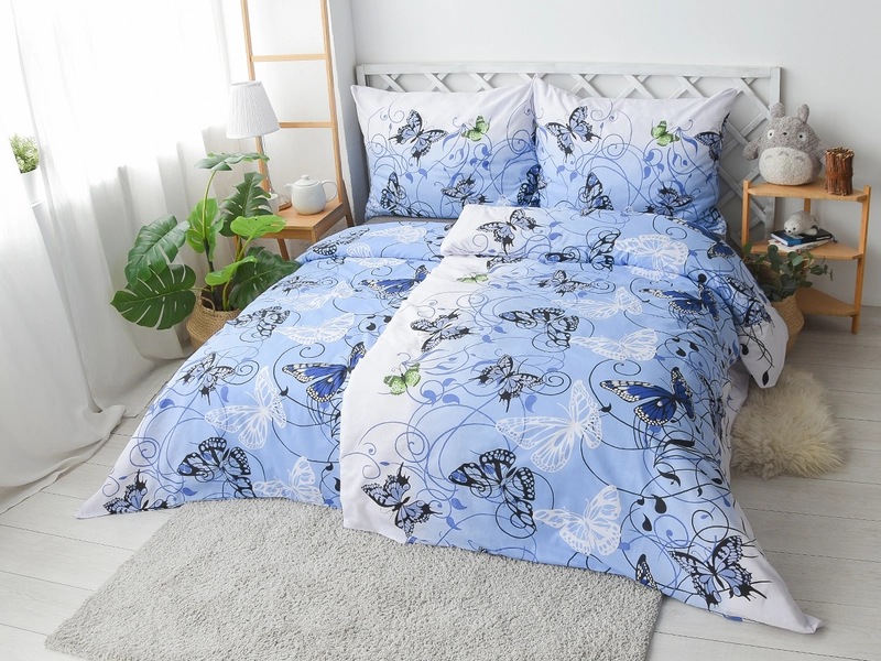 Ľahkosť a krása motýlich krídiel zdobí romantické obliečky KAROLÍNA, ktoré budú šperkom v každej spálni. Modrý podklad s pozvoľným prechodom do bielej kontrastuje s výraznými krídlami motýľov a utvára tak harmonický celok. Navodenie pokojnej nálady spolu so vzdušným materiálom 100% bavlny, ktorý je savý a príjemný na dotyk je ideálnou kombináciou k nerušenému spánku. Využite výhodný set 2+2 na dve klasické lôžka.