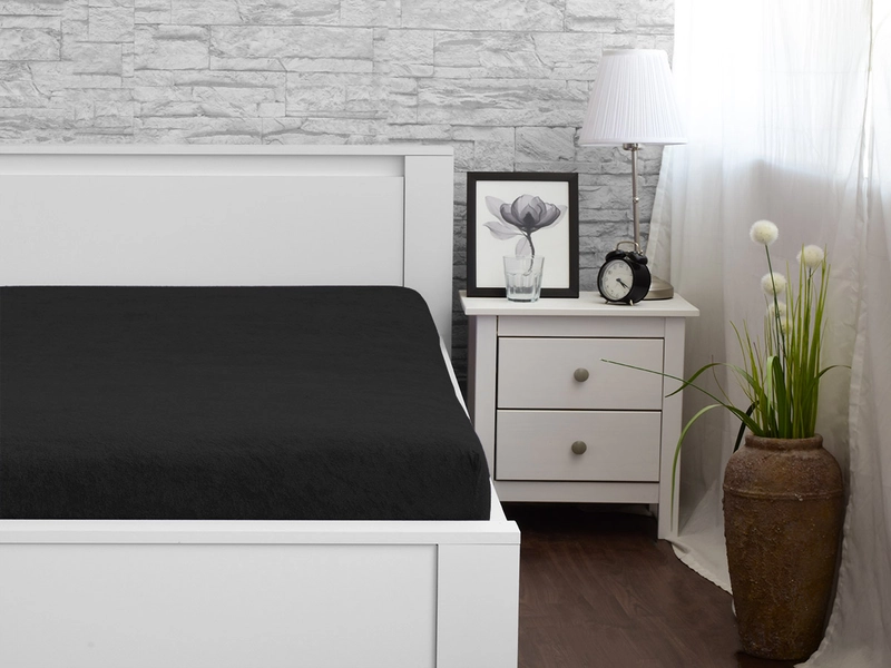 K pekným obliečkam bezpochyby patria vkusne zladené froté plachty. Tvorí ich hrejivá, mäkká a na dotyk príjemná slučková tkanina, ktorá sa skladá z 80% bavlny a 20% polyesteru. Čierne plachty miestnosť utlmia, efektne doplnia svetlý interiér a doladia minimalistický štýl spálne. Spoločne s výberom obliečok podľa farby aj s obliečkami na vankúšiky efektne doladí moderný interiér. Obľúbite si ich pre nenáročnú údržbu bez žehlenia a ľahkú manipuláciu. Spodná časť plachty je zakončená všitou gumou, vďaka ktorej sa ľahko upevní na matrac a dobre na ňom drží.