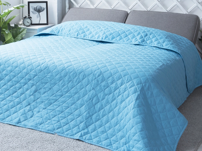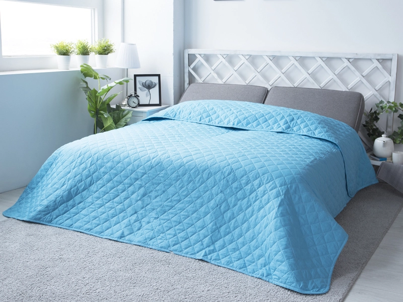Modrý prehoz pre modernú spálňu a ochranu lôžkovín