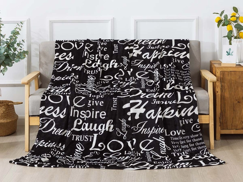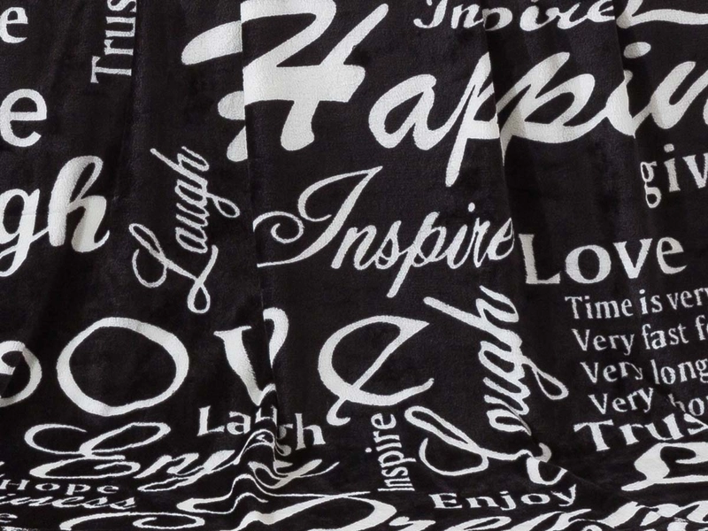 Jedna nikdy nestačí! Hodvábnu jemnosť a príjemné teplo ponúka mikroplyšová deka DORA ktorá si vás získa už na prvý dotyk. Prevedenie čierneho podkladu nechá krásne vyniknúť nápisy v bielej farbe a tie vnesú moderný nádych do každého interiéru.Vďaka praktickým vlastnostiam poslúži aj ako prikrývka, alebo efektný prehoz. Mikroplyš v podobe jemných chĺpkov si užijete pri odpočinku pri šálke voňavého čaju či s rodinou a priateľmi za chladných večerov po celý rok, no hlavne v období zimy. Oceníte stálofarebnosť a nadýchaný vzhľad aj pri častom praní.
