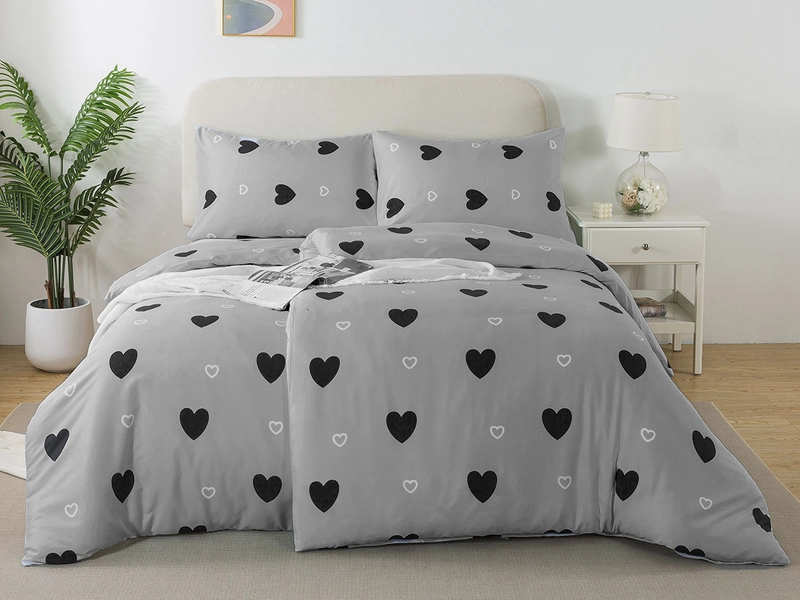 Hebučké mikrosaténové obliečky LOVE povedia za vás "milujem ťa". Romantický motív čiernych a jemných bielych srdiečok na sivom podklade príjemne ozdobia nejednu spálňu či dievčenskú izbičku. Neutrálna kombinácia vám dá priestor pre farebnú plachtu podľa nálady. Oddajte sa pokojnému spánku, všetko ostatné zabezpečí mikrosatén. Husto tkané tenké umelé vlákna sú stálofarené a ušetria vám čas s ľahkou údržbou bez nutnosti žehlenia.