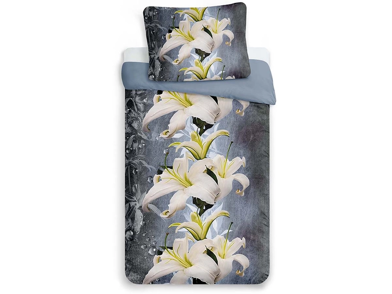 Obliečky s nežným motívom rozkvitnutých kvetov ĽALIE na modrosivom podklade potešia romantické duše a ozdobia nejednu spálňu. 3D obliečky kvety tvorí mikrovlákno s nepatrne lesklým a hladkým povrchom. Jemnosť materiálu zdatne dopĺňajú dobré absorpčné vlastnosti a farby odolné voči praniu.