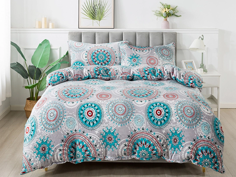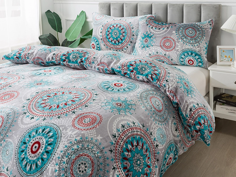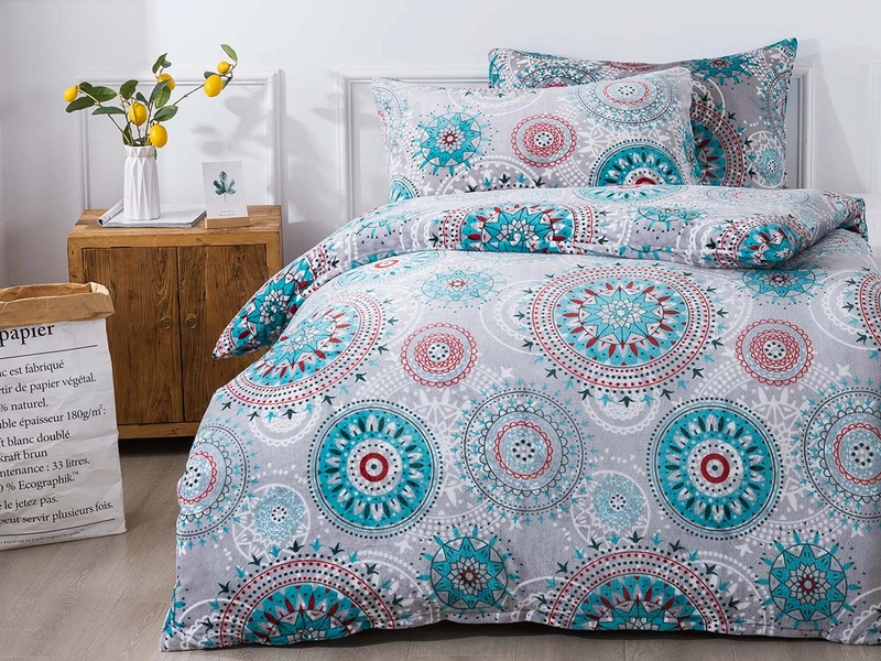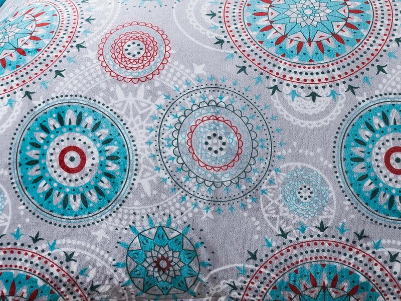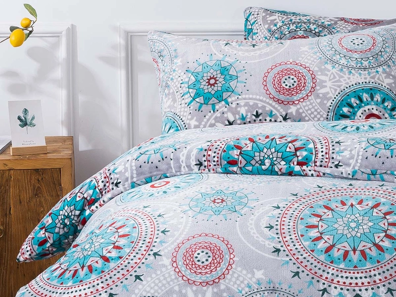 Váš sen sa stane skutočnosťou s mikroplyšovými obliečkami vo francúzskom rozmere ideálnymi pre chladné zimné dni. Efektný sivý podklad zdobia farby tyrkysu, bielej a červenej vo vzore mandál KIM. Obliečky tak vdýchnu spálni či izbičke príjemnú a sviežu energiu. Mikroplyš je tvorený z jemných priadzí mikrovlákna s krátkymi chĺpkami, ktoré navodia útulne a teplo až ku končekom prstov na nohách, čo vás uvoľní a ukolíše k hlbokému spánku. Zamilujete si aj vlastnosti materiálu, ktoré rýchlo schnú, nežmolkuje, nepotrebuje žehlenie, pretože sa nekrčí a zostáva nadýchaný. Farby sú stále, a aj pri častom vypraní ostanú ako nové.