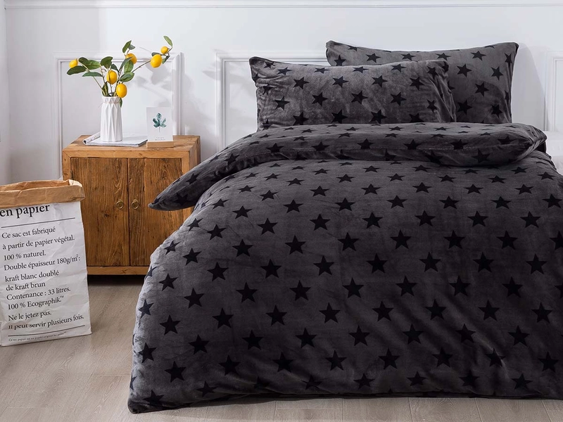 Mikroplyšové obliečky TARA vo francúzskom rozmere sú ideálnou posteľnou bielizňou nielen na zimu. Pôsobivej kombinácii sivého podkladu a čiernych hviezdičiek jednoducho neodoláte. Zamatový vzhľad bude šperkom svetlej spálne či izbičke a v objatí hrejivého mikroplyšu si chvíle oddychu doslova užijete. Základom je jemné mikrovlákno s krátkymi chĺpkami, ktoré má výnimočnú schopnosť vytvárať v posteli útulne a teplo. Nezanedbateľné nie sú ani vlastnosti obliečky, ako napríklad stálofarebnosť, odolnosť a krásne nadýchaný vzhľad aj pri častom praní.