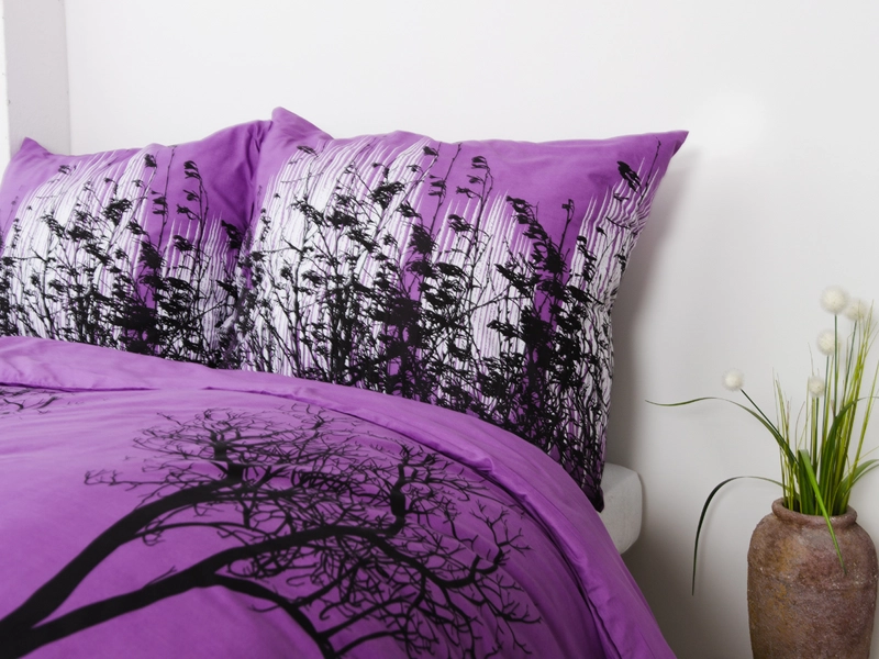 Abstraktné poňatie prírody ponúkajú bavlnené obliečky YAKAMOZ. Vyobrazené štíhle stromčeky na lila fialovom podkladu, dopĺňajú husté vetvy s bielo zosvetleným pozadím. Atraktívny vzor spolu s odolným a zároveň jemným materiálom zo 100% bavlny doladí každú spálňu a stane sa neprehliadnuteľným kúskom vášho domova.