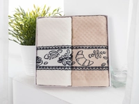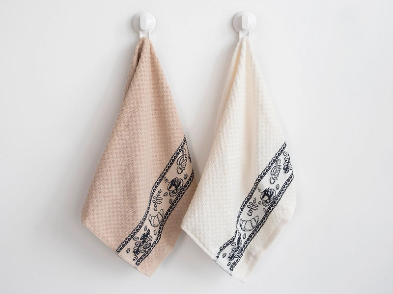 Vysoko savé froté utierky sú v domácnosti nepostrádateľným pomocníkom. Mäkká nadýchaná bavlna pohladí vaše ruky a spríjemní tak upratovanie linky aj jedálenského stola, krásne vysuší riad a nezanechá na ňom žiadne vlákna. Kuchynské utierky zdobí ľúbivý dekór hnedej výšivky COFFEE v spodnej časti, ktorý efektne dopĺňa buď béžové, alebo svetlo krémové prerušované froté tvoriace drobný vzor šachovnice z oboch strán.