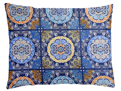 Honosný motív ASHLEY tvoria symetricky usporiadané prepracované vzory mandál, ktoré skladbou pripomínajú patchwork. Bavlnené obliečky sú na podklade tmavo modré a to dáva krásne vyniknúť dominantnej tyrkysovej a horčicovej farbe. Tento osobitý štýl sa hodí do svetlých, prírodne ladených i rustikálnych spální. Každý váš odpočinok vylepší 100% bavlna v prevedení Renforcé čo ponúka príjemne hladký povrch, savosť a vysokú odolnosť materiálu aj farieb.