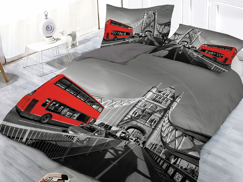 Oblečte svoju posteľ do nádherných vzorov v červenej a sivej farbe, ktoré ponúkajú 3D obliečky LONDÝN 3. Potešia milovníkov histórie tohto Kráľovského mesta, ktorého symboly sú aj poschodové autobusy, most Tower Bridge a mnoho ďalšieho na obliečkach, dodá interiéru osobitou atmosféru. Jemné mikrovlákno je spracované do príjemného materiálu, ktorý je mimoriadne odolný, dobre drží farby, rýchlo schne a nemusí sa žehliť.