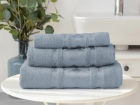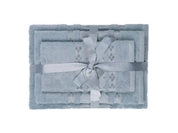 Hľadáte praktický, a pritom krásny darček? V tom prípade je darčekový set uterákov správnou voľbou. Set troch uterákov je zdobený jemnou bordúrou a ako darček previazaný saténovou stužkou je vhodný aj pre rodinu či známych. Bavlnený materiál v sivomodrej farbe doladí aj vašu kúpeľňu a pokožku dokonale osuší.