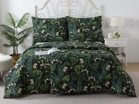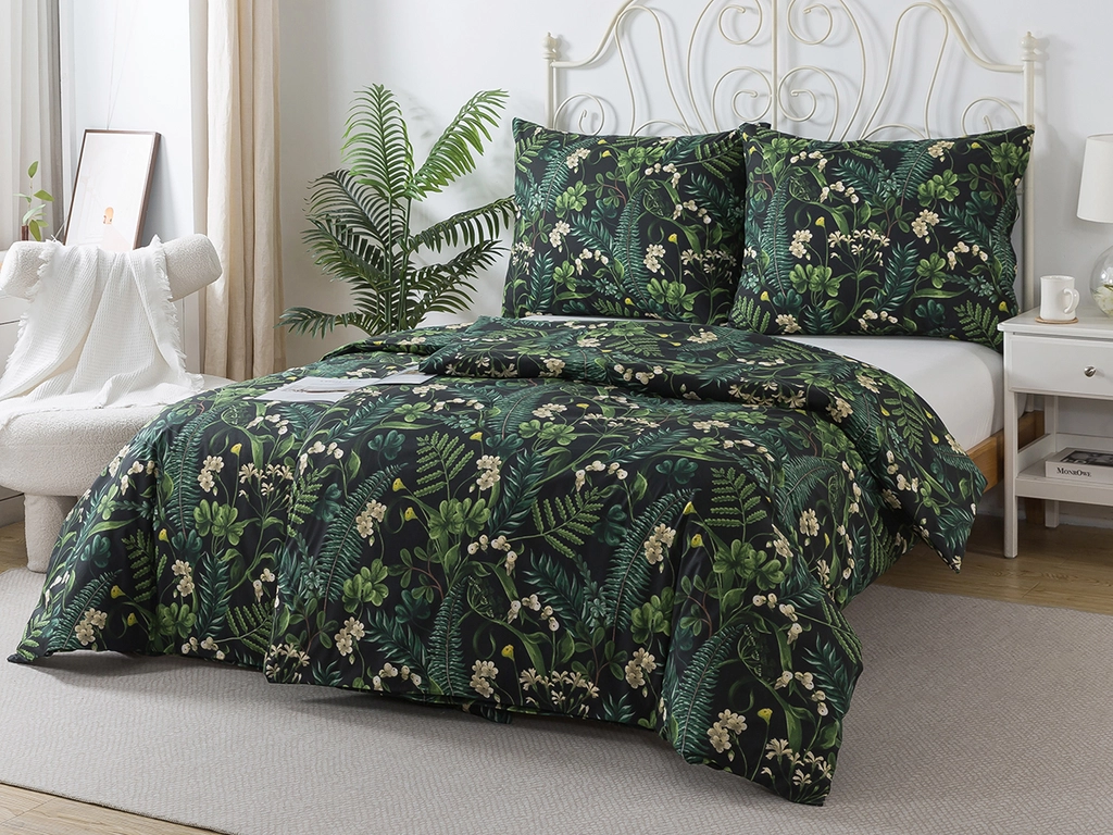 Objavte pokoj a čaro prírody s obliečkami LESNÁ NOC, ktoré vás prenesú do tichého lesa plného zelene. Jemný motív listov a bielych kvetov v decentných odtieňoch tmavozelenej na čiernom podklade vnesie do vašej spálne harmóniu a pokojnú atmosféru. Luxusné obliečky z kvalitnej 100 % bavlny Renforcé vynikajú svojou jemnosťou, pevnosťou a prirodzenou hebkosťou. Materiál je príjemný na dotyk a zároveň odolný voči opotrebovaniu aj častému praniu. Povrch látky je dokonale hladký a zaručuje pohodlie počas celej noci. Set obliečok 140×220 + 70×90 cm má zapínanie na gombíky a je vhodný na veľkú prikrývku manželskej postele.