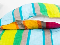 Farby zaručene zdvihnú náladu, tak prečo si ich nekúpiť aj do spálne? Predĺžené krepové obliečky TAMARA 1 zdobia pruhy a odtiene farieb tmavo malinovej, oranžovej, modrej a zelenej na hnedom zemitom podkladu. Jedinečný textilný kúsok sa hodí do manželských spální, ale aj do detských izbičiek. 100% bavlna v krepovej úprave ponúkne savosť, vzdušnosť a odolnosť materiálu s nenáročnou údržbou bez žehlenia. Krepové obliečky 140x220 cm sú vhodné najmä pre vyššie postavy.