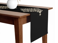Obrus na stôl je so skladbou ornamentov na čiernom podklade originálny dekoratívny doplnok pre stolovanie. Stredový obrus ilustruje aktuálne trendy vo svete bývania a spríjemní tak každú chvíľu strávenú s rodinou či priateľmi. Behúňove obrusy sú vyrobené z kvalitných umelých vlákien, ktoré sa dajú ľahko vyprať, rýchlo schnú a po vypraní si krásne držia farby. Spodná strana obrusu je biela, okraje sú ukončené ozdobným oblúčkovým zastrihnutím bez obšitia.